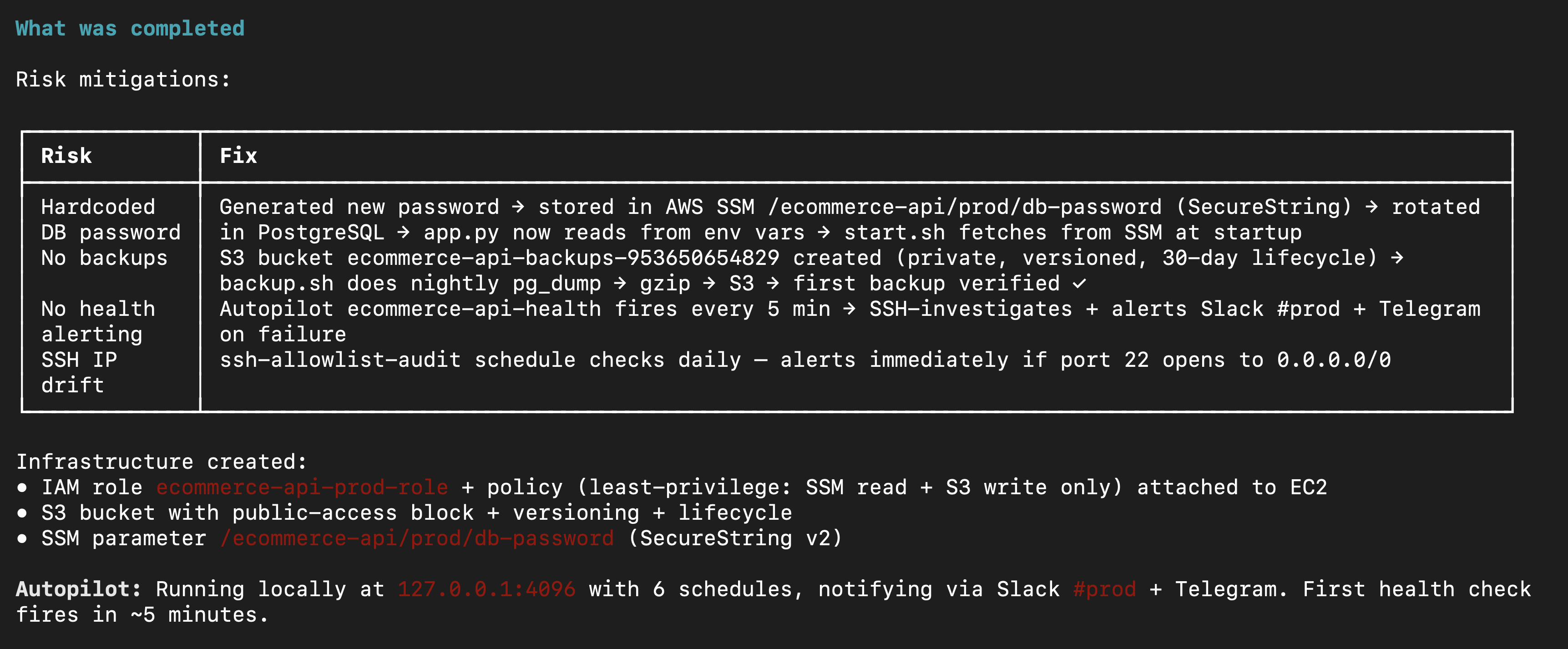 * Offers to set up Stakpak [autopilot](https://stakpak.gitbook.io/docs/how-it-works/autopilot "mention") to monitor your infrastructure 24/7, detect unexpected changes, fix what’s safe, and only alert you when it actually matters.